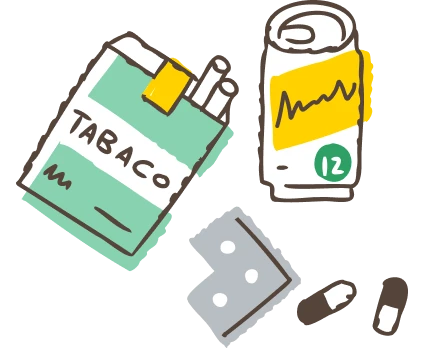 アルコール、違法薬物(覚せい剤、大麻、コカイン、危険ドラッグなど)、処方薬・市販薬、たばこ など