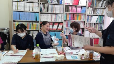 4月に就職した看護師を対象に、摂食嚥下障害看護認定看護師からの講義を受け、演習で学びました。